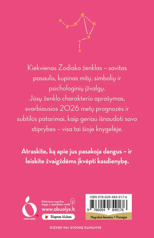 „Horoskopai 2026“ kolekcija – 12 Zodiako ženklų knygelių, atskleidžiančių kiekvieno charakterį, stiprybes ir sėkmės periodus. Atrask savo ženklą arba padovanok artimam žmogui – nes kiekvienas žvaigždynas slepia unikalią istoriją.