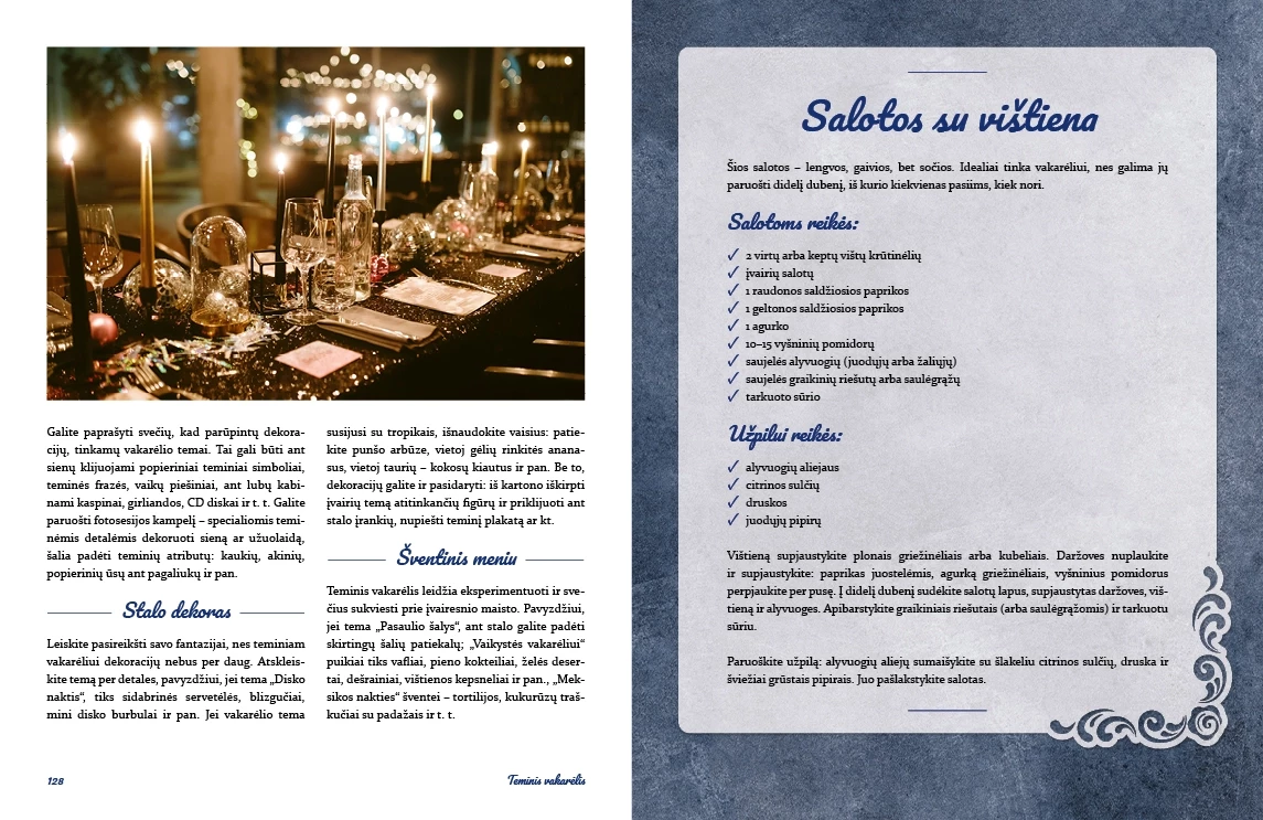 Ar ir jums prieš šventes darbų sąrašas atrodo begalinis? Norisi viską suplanuoti lengvai ir paprastai? Pamirškite rūpesčius – sukurti jaukią šventę padės ši knyga, kiekvieną progą paversianti džiaugsmu. Lai šventės prasideda nuo šiltų šeimos vakarų ir tęsiasi iki magiško Kalėdų stalo, triukšmingų gimtadienių, pašėlusių mergvakarių ar įsimintinų vestuvių.