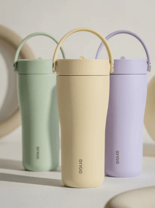 Puodelis pagamintas iš nerūdijančio plieno, dangtelis ir šiaudelis iš polipropileno, rankenėlė iš TPE plastiko, rankenėlės sujungimo sagelės iš plieno.