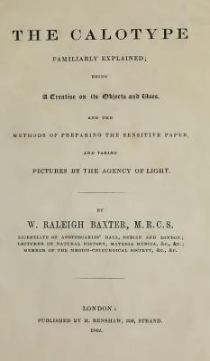 The Calotype, familiarly Explained: being a treatise on its objects and uses, and the methods of preparing the sensitive paper, and taking pictures by the agency of light Author: W Raleigh Baxter Publisher: London: H. Renshaw, 1842. Reproduction by James Gehrt - Front Porch Editions - 2019 Subjects Calotype, Photography -Early works to 1850, Photography, paper negative, history of photography, James Gehrt, Henry Fox Talbot, Talbotype, early photography, chemicals, process