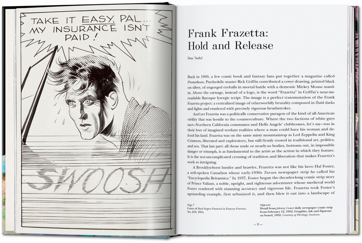 Frank Frazetta has reigned as the undisputed king of fantasy art for 50 years, his fame only growing in the years since his death. With his paintings now breaking auction records (Egyptian Queen sold for $ 5.4 million in 2019) he’s long overdue for this ultimate monograph.Born to a Sicilian immigrant family in Brooklyn, 1928, Frazetta was a minor league athlete, petty criminal and serial seducer with movie star looks and phenomenal talent. He claimed to only make art when there was nothing better to do – he preferred playing baseball - yet began his professional career in comics at age 16. Strip work led him to the infamous EC Comics, then to oils for Tarzan and Conan pulp covers. Both characters were interpreted by many before him, but as he explained in the 1970s, “I’m very physical minded. In Brooklyn, I knew Conan, I knew guys just like him,” and he used this first-hand knowledge of muscle and macho to redefine fantasy heroes as more massive, more menacing, more testosterone-fueled than anything seen before. As counterbalance he created a new breed of women, nude as censorship allowed, with pixie faces and multiparous bodies: thick thighed, heavy buttocked, breasts cantilevered out to there, yet still, with their soft bellies and hints of cellulite, believably real. Add in the action, the creatures, the twilit worlds of haunting shadow and Frazetta’s art is addictive as potato chips.
