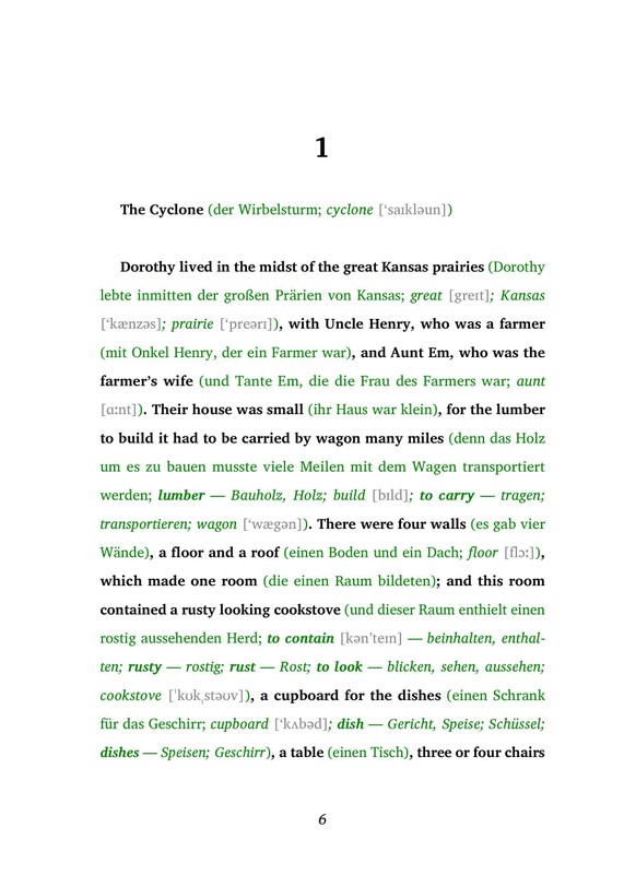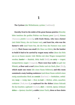 The Wizard of Oz - Der Klassiker neu entdecken mit der Frank-Lesemethode (A1-A2) Originaltext. Ungekürzt. Verständlich. Frank-Lesemethode. Begleiten Sie Dorothy auf ihrer fantastischen Reise ins geheimnisvolle Land Oz - durch Wirbelstürme, auf gelben Ziegelstraßen, vorbei an fliegenden Affen und hin zum großen Zauberer. Die zeitlose Geschichte von Mut, Freundschaft und innerer Stärke begeistert seit Generationen - und ist jetzt endlich auch für Englischlernende A1-A2 zugänglich. Dieses Buch enthält den vollständigen Originaltext von L. Frank Baum - nicht gekürzt, nicht vereinfacht, sondern leicht verständlich gemacht mit der bewährten Frank-Lesemethode. Die Frank-Lesemethode macht echtes Lesen möglich: Durch direkt eingefügte Übersetzungen und Erklärungen im Text verstehen Sie jedes Wort, ohne je den Lesefluss zu verlieren. So lernen Sie intuitiv Vokabeln, Grammatik und Redewendungen - ganz nebenbei beim Lesen. Ideal für alle, die sich einen Zugang zu englischer Literatur wünschen, auch mit geringen Vorkenntnissen. Ob im Selbststudium oder als Begleitung zum Unterricht - dieses Buch bringt Freude am Lesen und nachhaltigen Lernerfolg. Mit kostenlosem Hörbuch zum Mitlesen und Trainieren des Hörverstehens. Leseprobe: https://easyoriginal.com/leseproben/DE25.pdf