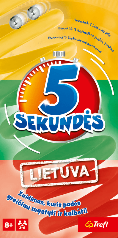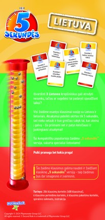 Išvardinti 3 Lietuvos krepšininkus gali atrodyti nesunku, tačiau ar sugebėsi tai padaryti spaudžiant laikui? Visi žaidime esantys klausimai susiję su Lietuva ir lietuviais. Atsakymui pateikti skirtos tik 5 sekundės, tad nieko nelauk ir kuo greičiau sakyk tai, kas ateina į galvą – čia priimami net ir patys keisčiausi ir juokingiausi atsakymai! Tai kompaktiška populiariojo žaidimo „5 sekundės“ versija, sukurta specialiai lietuviams! Šio žaidimo klausimus galima naudoti ir žaidžiant klasikinę „5 sekundės“ versiją – taip žaidimas bus dar smagesnis ir įvairesnis. Puiki pramoga bet kokia proga!
