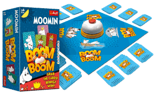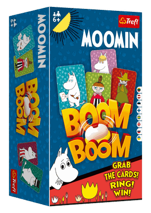 Boom Boom Muminas: 1. Greitai išsikeiskite kortas. 2. Surinkite 4 vienos rūšies kortas. 3. Paskambinkite skambučiu. 4. Laimėkite! Amžius: nuo 6 metų. Turinys: 56 kortos, skambutis, lenta ir instrukcija