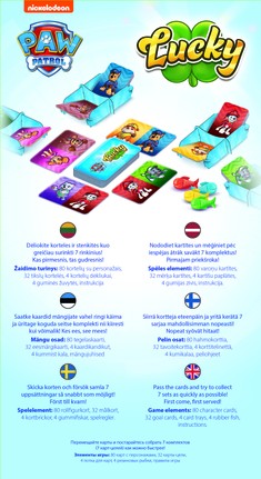 Žaidimas „Lucky“ – tai smagus greitas žaidimas, kuriame svarbiausia – įžvalgumas ir greitai reakcija. Žaidimo metu žaidėjai deda korteles su personažais į šalia esančius dėkliukus, kol kuris nors tampa laimėtoju. Pasirinkite vieną rankoje turimą kortelę, kurią norėsite įdėti į kairėje esantį dėkliuką. Tada traukite vieną kortelę iš dešinėje esančio dėkliuko. Abiejose kortelės pusėse pavaizduotas tas pats personažas. Visi žaidėjai korteles į dėkliukus deda vienu metu, tačiau kiekvienas savo tempu. Rankoje negalima laikyti daugiau kaip 5 kortelių su personažais. Jei iš tikslo kortelių krūvelės ištraukiate kortelę su žuvimi, stenkitės kuo greičiau pagauti atitinkamos spalvos guminę žuvytę. Pirmasis teisingą žuvytę pačiupęs žaidėjas pasideda ją prieš save kartu su žuvies kortele – taip pelnomas dar vienas taškas. Dėliokite korteles ir stenkitės kuo greičiau surinkti 7 rinkinius! Kas pirmesnis, tas gudresnis!