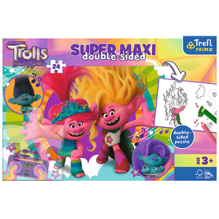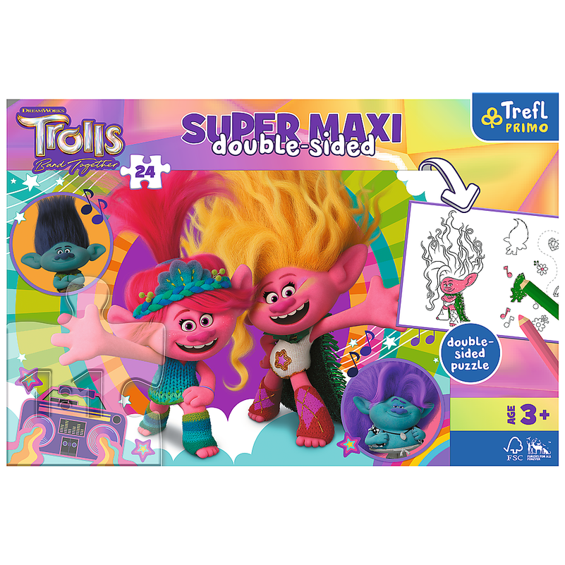 Trefl PRIMO - Super Maxi 24 - tai 3 žaidimai viename gaminyje: didelė 24 dalių dėlionė, spalvinimo knygelė ir žaidimas su elementais, kuriuos galima nuspalvinti kitoje dėlionės pusėje! Sudėliojus dėlionę bus sukurtas didelis 600 x 400 mm dydžio paveikslas. Modeliai su mėgstamais animacinių filmų ir vaikiškų serialų personažais! Ryškios spalvos ir draugiškos dėlionės formos skatina vaikus žaisti, o įdomios iliustracijos patraukia jų dėmesį. Didelės dėlionės dalys puikiai tinka mažoms rankoms. Dėlionių dėliojimas skatina smalsumą pasauliui ir vaizduotę, ramina vaiką, lavina koncentraciją ir įžvalgumą, lavina vaiko motoriką. Puiki dovana vyresniems nei 3 metų vaikams. Pagaminta iš saugių ir kokybiškų natūralių medžiagų, turinčių FSC sertifikatą.