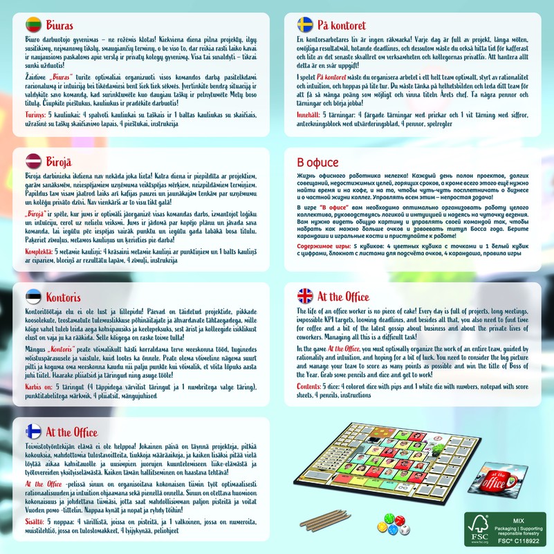 Biuro darbuotojo gyvenimas – ne rožėmis klotas! Kiekviena diena pilna projektų, ilgų susitikimų, neįmanomų tikslų, smaugiančių terminų, o be viso to dar reikia rasti laiko kavai ir naujausioms paskaloms apie verslą ir privatų kolegų gyvenimą. Visa tai suvaldyti – tikrai sunki užduotis! Žaidime „Biuras“ turite optimaliai organizuoti visos komandos darbą pasitelkdami racionalumą ir intuiciją bei tikėdamiesi bent šiek tiek sėkmės. Įvertinkite bendrą situaciją ir valdykite savo komandą, kad surinktumėte kuo daugiau taškų ir pelnytumėte Metų boso titulą. Čiupkite pieštukus, kauliukus ir pradėkite darbuotis!