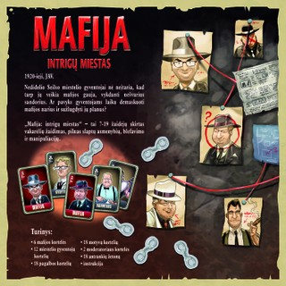 1920-ieji, JAV. Nedidelio Seilso miestelio gyventojai nė neįtaria, kad tarp jų veikia mafijos gauja, vykdanti nešvarius sandorius. Ar pavyks gyventojams laiku demaskuoti mafijos narius ir sužlugdyti jų planus? „Mafija: intrigų miestas“ – tai 7-19 žaidėjų skirtas vakarėlių žaidimas, pilnas slaptų asmenybių, blefavimo ir manipuliacijų.