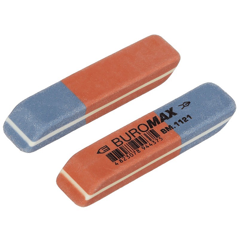 Medžiaga: sintetinė guma, minkšta. Dydis: 58 x 14 x 8 mm. Raudona pusė skirta trinti grafitinį pieštuką 3H - 2B; mėlyna- trina rašalą. Nepalieka dryžių ir nepažeidžia paviršiaus. Trinant susidaro minimalus trintuko dalelių kiekis, kurios susisuka į kamuoliuką ir neišsibarsto ant popieriaus. Kiekis dėžutėje: 60 vnt Kaina už 1 vnt Prekės ženklas: Buromax