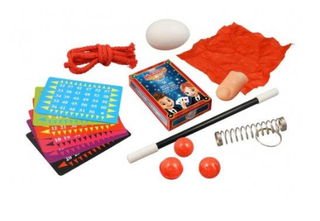 Į komplektą įeina: 1 kortų pakuotė, 1 nykštys, 1 mentalizmo kortelės, 1 stebuklingas kiaušinis, 3 raudonos virvelės, 1 stebuklinga lazdelė, 3 kamuoliukai ir 1 pusrutulis, 1 spyruoklė, 1 žiedas, 1 šalikas ir 1 iliustruotas lapas.