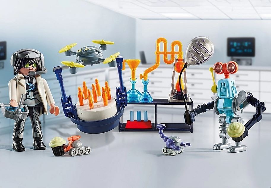 Nusikelkite į įdomų tyrimų ir robotikos pasaulį su PLAYMOBIL Tyrėjų ir Robotų Dovanų Rinkiniu. Dėl stilingo įpakavimo ne tik sutaupysite dovanų apipavidalinimo, bet taip pat galėsite surengti nuostabią mokslo tema paremta šventę. Tyrėjas švenčia savo gimtadienį laboratoriijoje, o jo robotų draugai pasirengę linksmintis! Dronas pristato skanų tortą, kol mini robotai atneša muffins, o didysis robotas didžiuodamasis laiko šventinį balioną. Mažas dronas su besisukančiais rotoriais yra tikras skraidantis stebuklas, kurį galima valdyti nuotoliniu būdu. Rėmas lengvai tvirtinamas prie drono apačios. Universalus robotas gali stovėti arba sėdėti, judinti rankas pečių lygyje, o jo rankos gali suktis visuose kampuose. Kai jam reikalinga sėdimoji padėtis, tiesiog pakelkite kojų dalį į viršų. Šis dovanų rinkinys daro mokslo tyrinėjimą vaikų žaidimu. Puiki staigmena mokslo mėgėjams nuo 4 metų amžiaus.