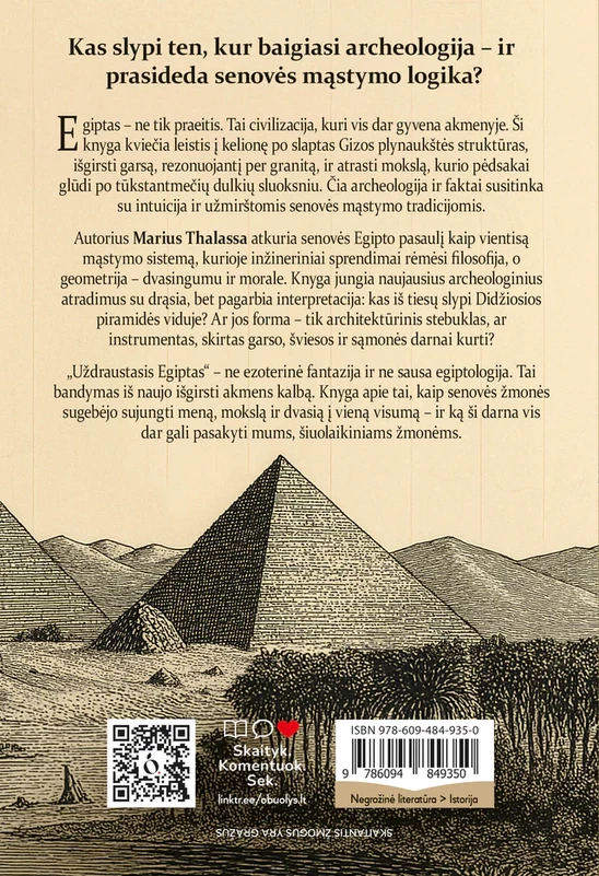 Naujoje knygoje „Uždraustasis Egiptas. Prarastojo faraonų mokslo paslaptys“ tyrinėtojas Marius Thalassa leidžiasi į kelionę nuo Gizos plynaukštės iki nuskendusių Nilo deltos miestų, nuo Göbekli Tepe šventyklų Turkijoje iki Egipto raštų, kalbančių apie Pirmąjį laiką – epochą, kai žmogus, žemė ir dangus buvo viena sistema.