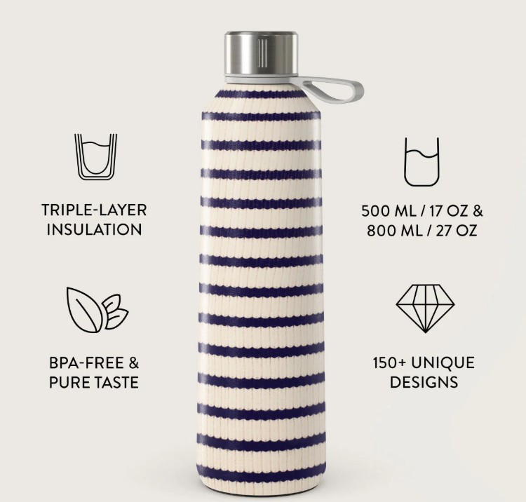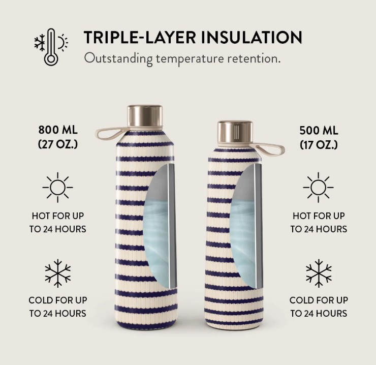 • Aukščiausios kokybės medžiagos: be BPA ir švino, nerūdijantis plienas su trijų sluoksnių izoliacija.
