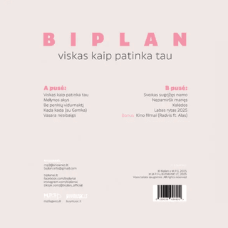 Vinilinė plokštelė LP BIPLAN „Viskas Kaip Patinka Tau" (LP). Biplan – „Viskas kaip patinka tau“ (LP): ilgai lauktas 2025 m. studijinis albumas vinile su hitais „Mėlynos akys“ ir „Labas rytas 2025“. Takelių sąrašas:A1. Viskas kaip patinka tau 2:58A2. Mėlynos akys 3:44A3. Be penkių vidurnaktį 3:36A4. Kada kada (feat. Gamka) 3:37A5. Vasara nesibaigs 4:34 B1. Sveikas sugrįžęs namo 3:48B2. Nepamiršk manęs 3:07B3. Kalėdos 3:54B4. Labas rytas 2025 3:27B5. Kino filmai (Remix by Radvis) 2:37