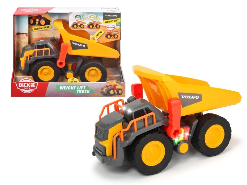 CONSTR Tipper Volvo su 3 apšvietimo ir garso efektais Transporto priemonė be variklio, Su šviesa ir garsu Reaguoja į 3 skirtingas apkrovas, įjungiant šviesą (žalia - lengva apkrova, oranžinė - vidutinė, raudona - per sunki) ir įspėjimo garsą. Judantis kranas Dickie Toys specializuojasi detalizuotuose, dažnai nuotoliniu būdu valdomuose, automobilių, sunkvežimių ir statybos technikos modeliuose. Tai puikus pasirinkimas mažiesiems technikos entuziastams.Prekės aprašymas sugeneruotas DI pagalba.