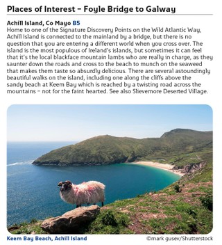 Handy full-colour map of Ireland's Wild Atlantic Way with a high level of detail. Clear mapping of the full 2500 km (over 1500 miles) route, showing the road network and places of interest.