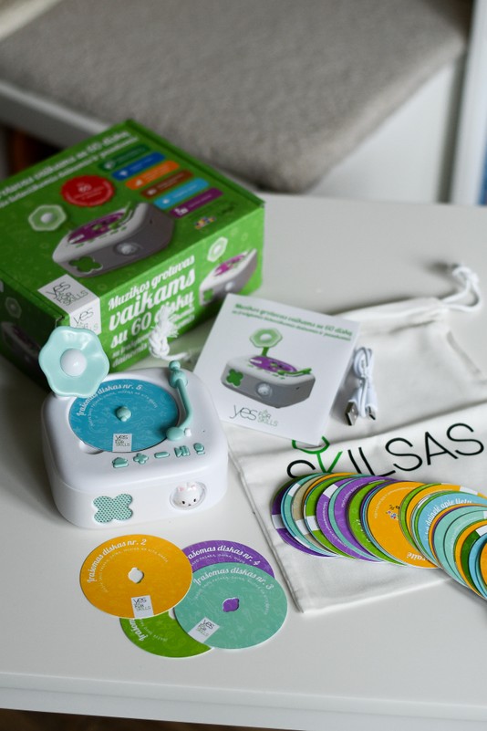 Leiskitės į vaizduotės pasaulį, klausydamiesi lietuviškų dainų ir pasakų! Įstatykite vieną iš diskų į jam skirtą vietą muzikos grotuvo korpuso viršuje, švelniai pastumkite plastikinę grotuvo detalę disko link ir užliekite vaiko kambarį, šeimos automobilį, žaidimų erdvę ar bet kokią kitą aplinką nuostabiomis melodijomis ir įdomiausiomis pasakomis.