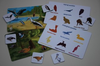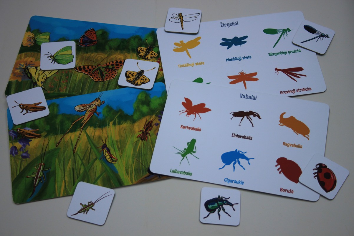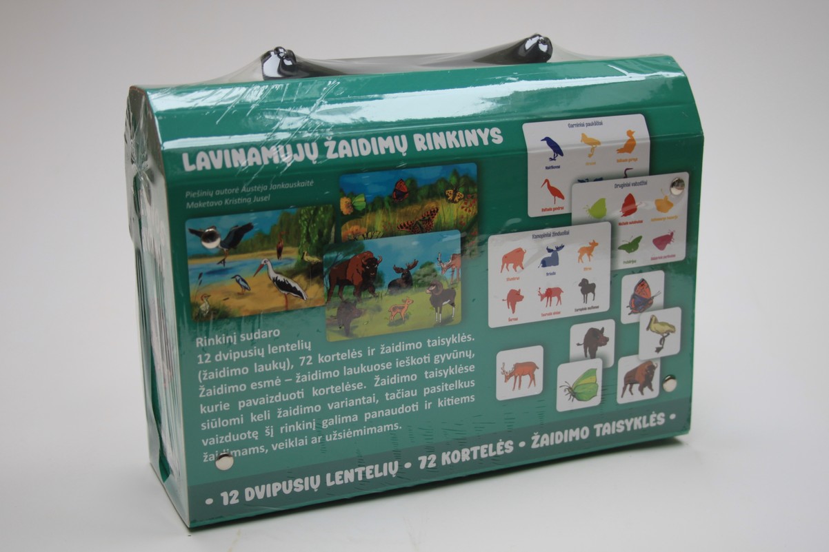 Rinkinį sudaro 12 dvipusių žaidimo lentelių, 72 kortelės ir žaidimo taisyklių lapas. Kiekvienoje lentelėje pavaizduoti 6 gyvūnai. 4 lentelėse vaizduojami paukščiai, 4 lentelėse – vabzdžiai, 4 lentelėse – žinduoliai. Vienoje lentelės pusėje jie yra spalvoti gamtos apsuptyje, kitoje pusėje vaizduojami vienspalviai jų šešėliai ir ties kiekvienu užrašytas pavadinimas. Žaidimo kortelėse jų paveikslėliai yra tik vienoje pusėje. Visi šie gyvūnai aptinkami Lietuvoje. Tad žaisdami šį žaidimą ne tik patirsite daug smagių akimirkų, bet ir geriau pažinsite mūsų šalies paukščius, vabzdžius ir žinduolius, išmoksite jų pavadinimus.