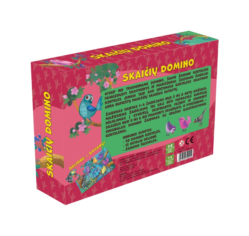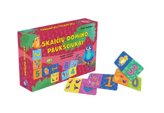 Pažink skaičius! Žaisk domino! Paukščiukų dėlionė – dovanų! Rinkinio sudėtis: 28 domino kortelės, 12 detalių dėlionė, žaidimo taisyklės. Kitaip nei tradiciniame domino, šiame žaidime kortelėse pavaizduoti skaitmenys ir paukščiukai. Žaisdami žaidėjai korteles jungia taip, kad gretimose kortelėse skaitmuo arba nupieštų paukščių skaičius sutaptų. Prie padėtos kortelės galima pridėti tik tokią kortelę, kurioje yra toks pats skaitmuo arba nupiešta tiek pat paukščiukų. Žaidimas skirtas 1–4…
