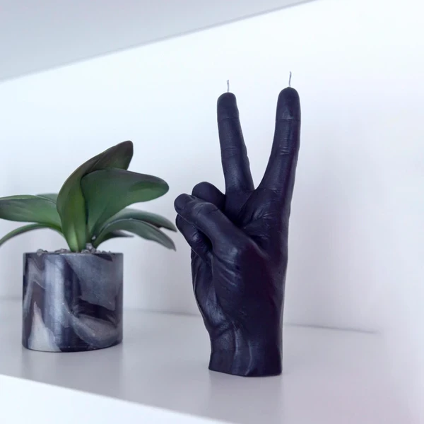 Nugalėtojai ir taikos mylėtojai sutinka – nėra geresnės žvakės už šią gražią, rankų darbo, natūralaus dydžio V formos žvakę. Galima rinktis iš įvairių spalvų. Supakuota kaip nugalėtoja, tokia pat tikra kaip hipio širdis.
