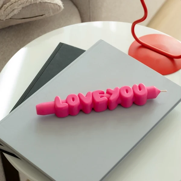 Siaurėjanti žvakė su aiškia žinute „Myliu tave“. Leiskite žvakei kalbėti už jus. Ši žvakė pagaminta rankomis nuo formos iki pat pabaigos.