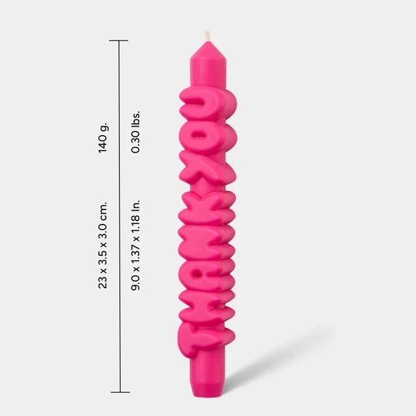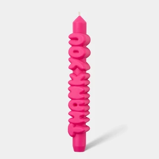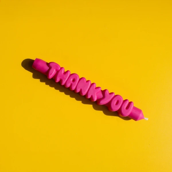 Siaurėjanti žvakė su aiškia žinute „Ačiū“. Leiskite žvakei kalbėti už jus. Ši žvakė pagaminta rankomis nuo formos iki pat pabaigos.